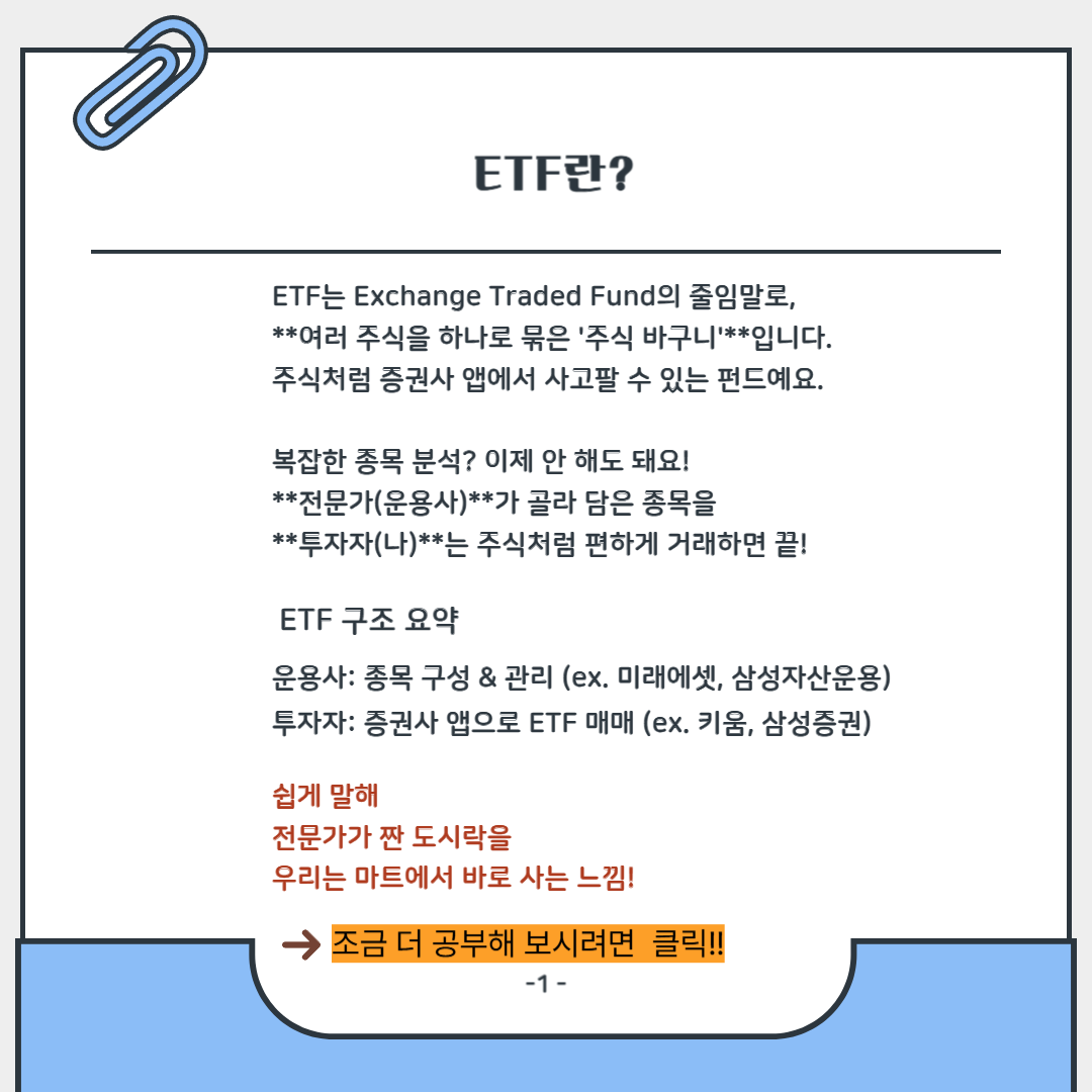 → 개별 종목 리스크가 부담스럽다면 ETF로 폭넓게 투자 가능!