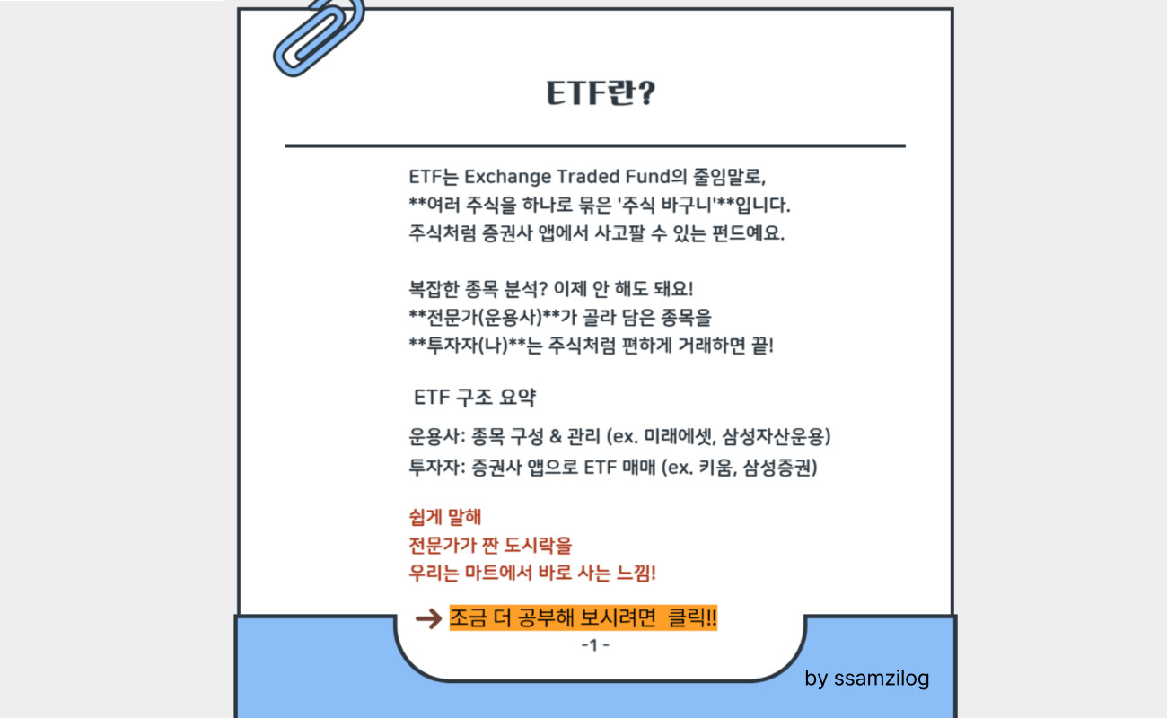 📘ETF란? 주식처럼 사는 바구니 투자 완전정리“ETF? 들어는 봤는데... 뭔가 무서워서 안 사봤어요.”“펀드랑 비슷하다던데, 뭐가 다른 건가요?” 👶 주식 투자를 시작하면 누구나 한 번쯤 듣게
