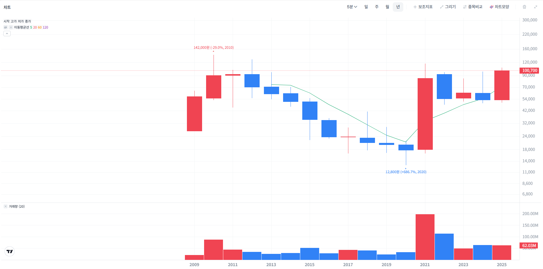 - 2020년 12,800원 → 장기 우상향 진입