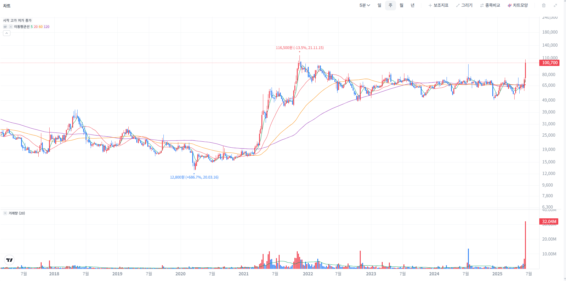 24년: 6만 8만원 박스권 - 2025년 6월: 신고가 돌파 + 단기 과열 지정