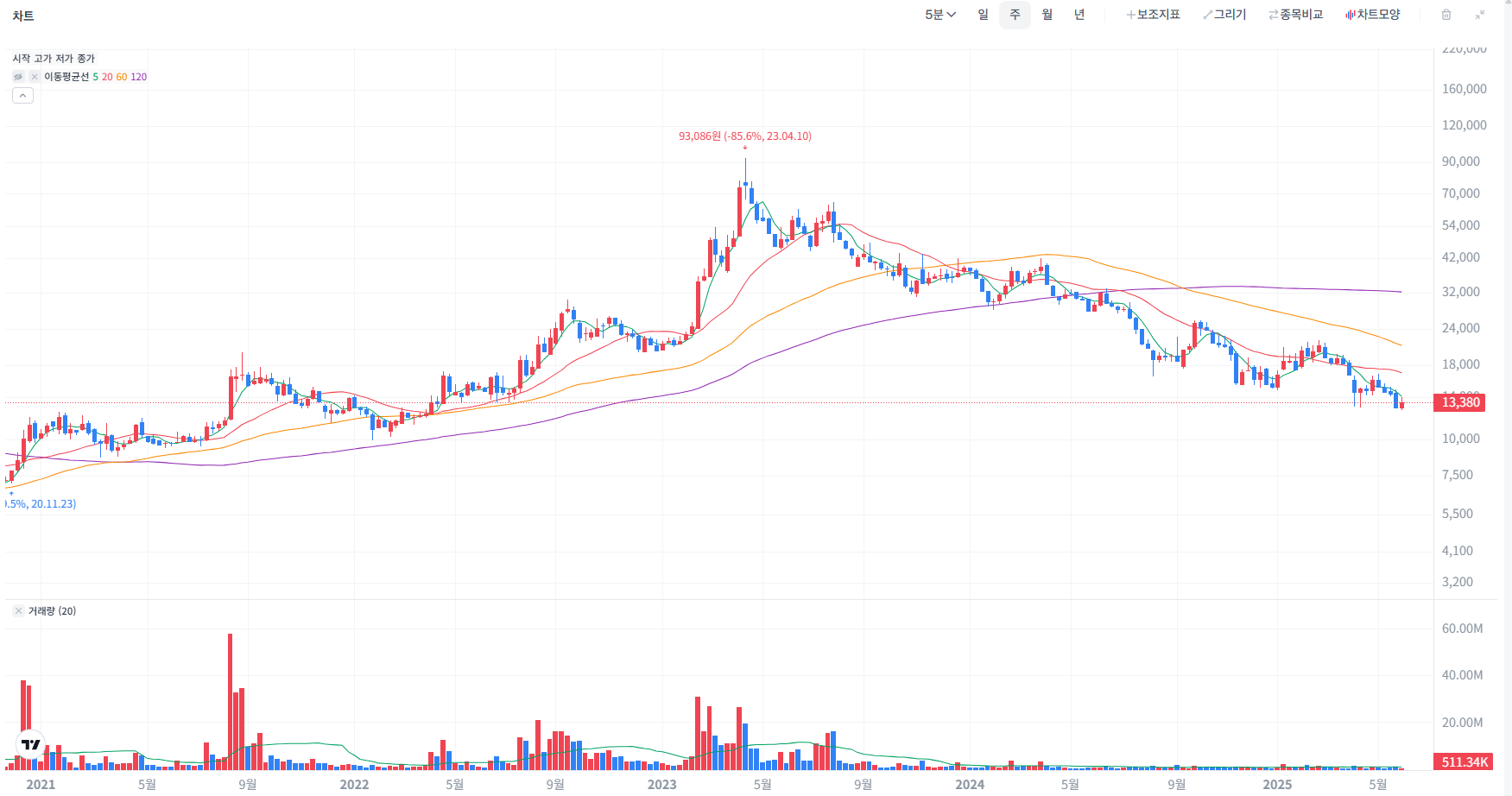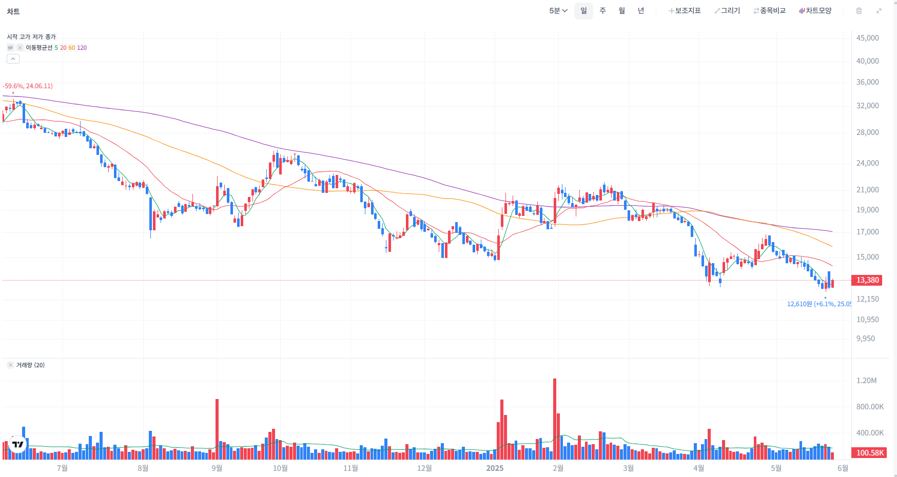 - 12,500~13,000원 구간에서 지지 테스트 중