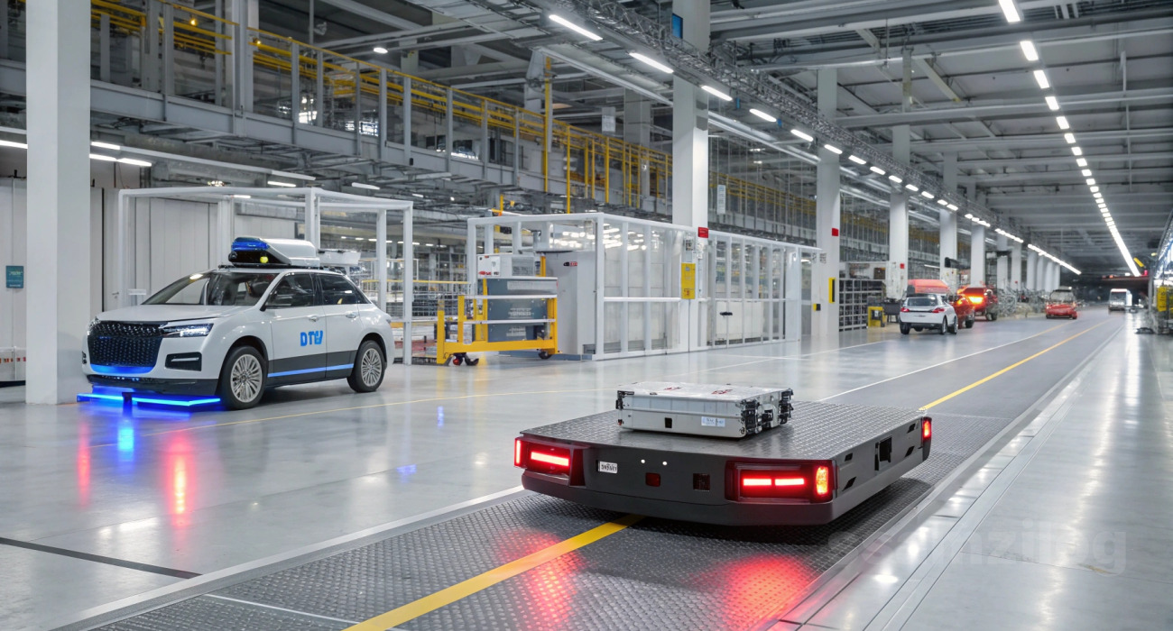공장 내 생산라인과 창고를 자동 연결해 자재를 이송하는 로봇 차량입니다