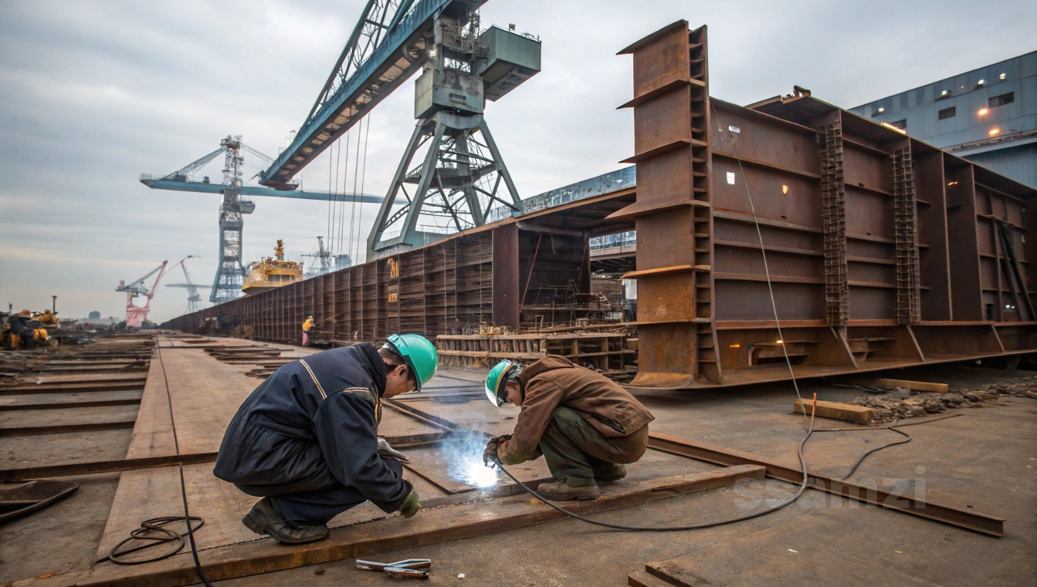 선박은 워낙 크고 복잡해서 한 번에 만들 수 없습니다. 따라서 큰 블록 단위로 나눈 뒤 제작·용접·도장을 하고, 최종적으로 조선소에서 레고처럼 조립하는 방식을 씁니다.